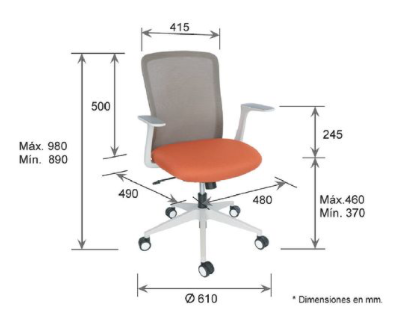 - Mecanismo: Plato de acero reforzado tipo reclinable con palanca de accionamiento para regular la altura y bloqueo del pistón neumático. Cuenta con regulador de tensión de la inclinación y está terminado en pintura electrostática epóxica color negro. El sistema de elevación utiliza un pistón de gas nitrógeno con fuerza de levante de 350 N y una vida útil de 50,000 ciclos.