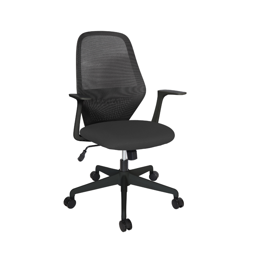 - Diseño: Ergonómico de respaldo alto con bastidor de polipropileno de alta densidad en color negro y soporte lumbar integrado. El asiento cuenta con un interior de madera de triplay preformado de 14 mm y un acojinado de hule espuma de poliuretano inyectado de 50 mm de espesor, con una alta densidad de 60 kg/m³, alta resiliencia y propiedades retardantes a la flama. Incluye brazos de polipropileno semirrígido.