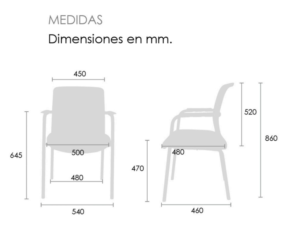 - Base: Estructura fabricada en perfil redondo tubular de acero de 1" de diámetro (calibre 14). Incluye soportes internos en forma de parrilla de perfil redondo de 1" (calibre 14) y un travesaño de unión de 5/8" (calibre 14). Los brazos forman una extensión de las mismas patas traseras. Todo el conjunto cuenta con un acabado en color negro.