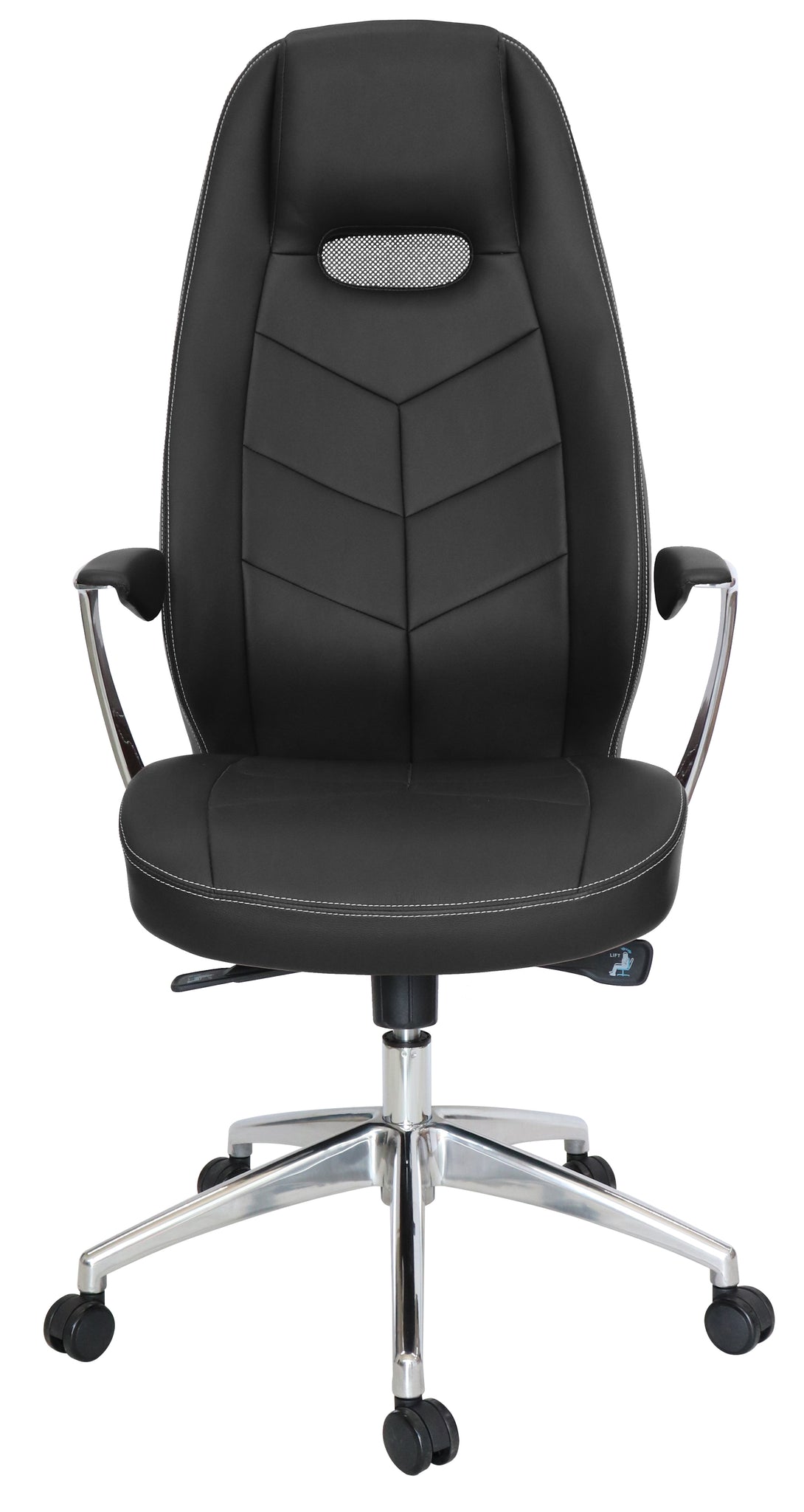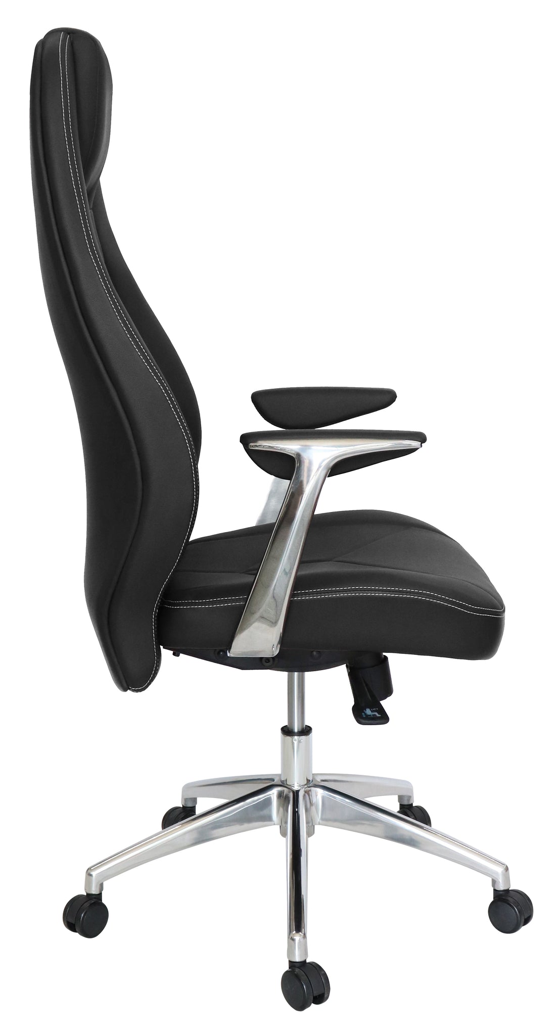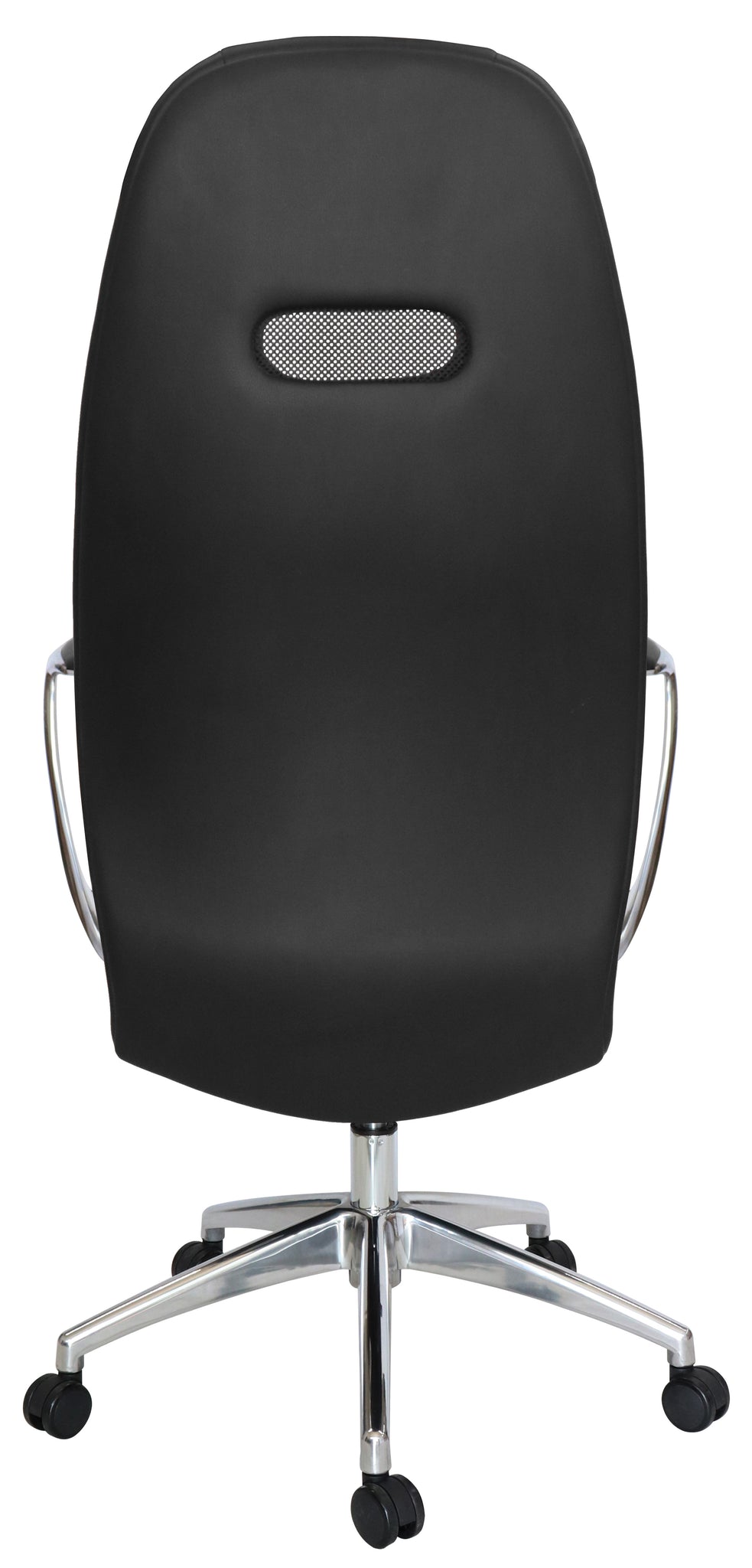 - Diseño: Respaldo alto, asiento y respaldo acojinados con hule espuma laminada, con solera de acero de 8mm para la fijación con la base, diseño ergonómico, cabecera con malla, brazos de aluminio fundido y pulido con terminado natural, acojinados y tapizados en soft revolving leather color negro.