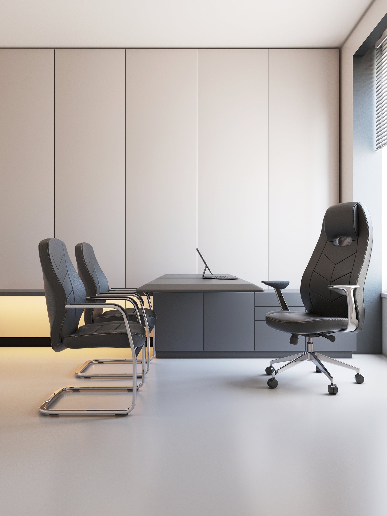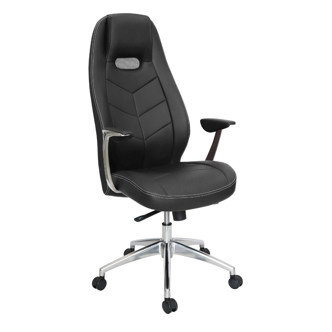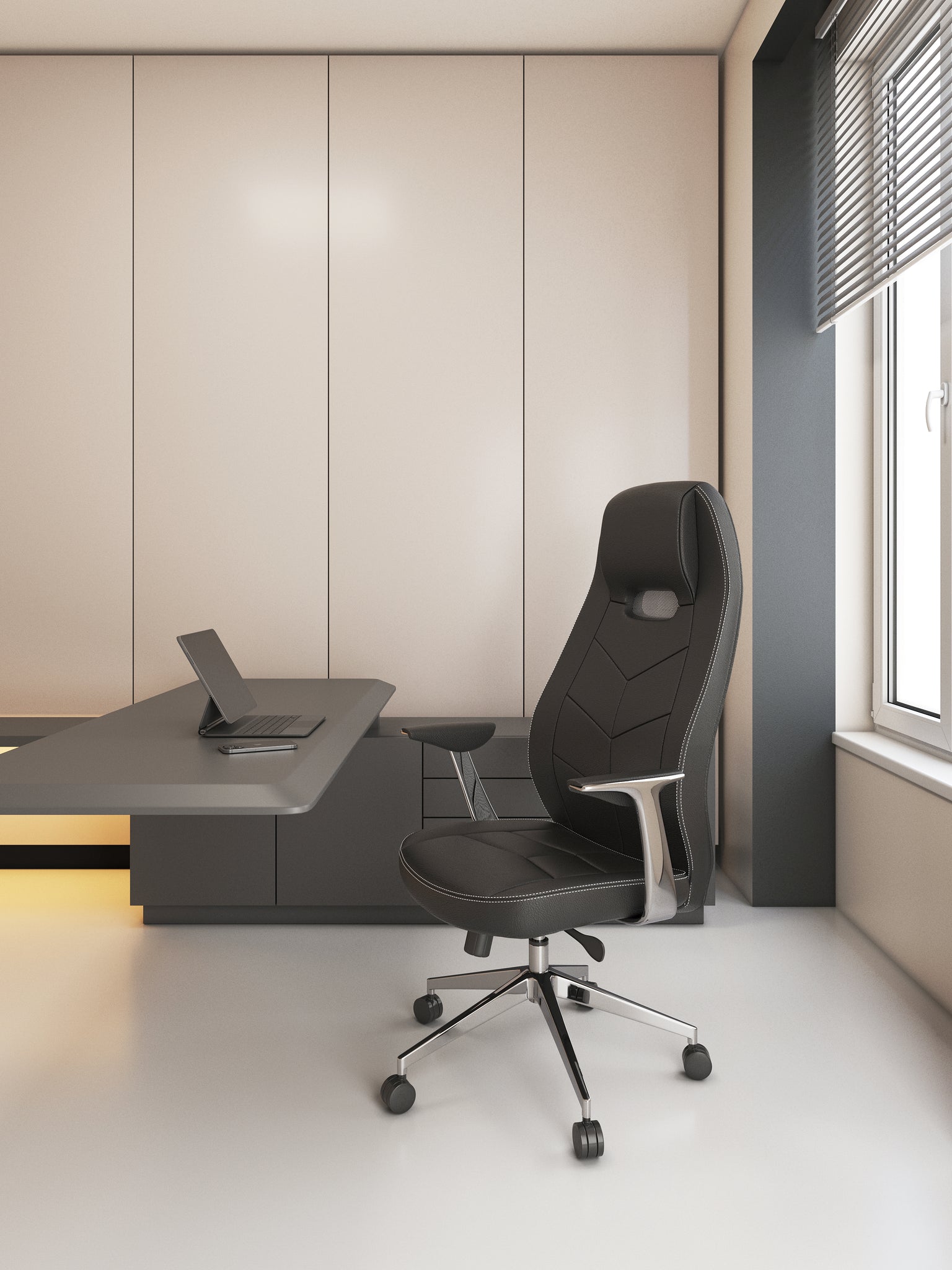- Diseño: Respaldo alto, asiento y respaldo acojinados con hule espuma laminada, con solera de acero de 8mm para la fijación con la base, diseño ergonómico, cabecera con malla, brazos de aluminio fundido y pulido con terminado natural, acojinados y tapizados en soft revolving leather color negro.
