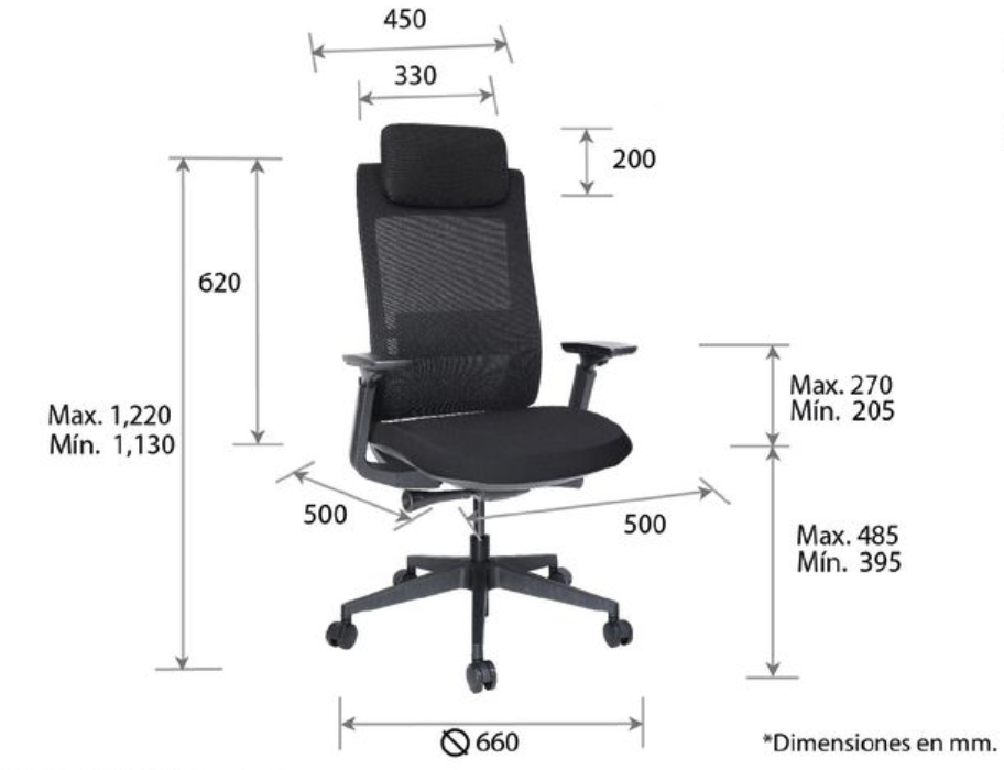 - Diseño: Ergonómico de respaldo alto con cabecera acojinada y soporte lumbar ajustable, respaldo en malla color negro y asiento con tapa protectora de polipropileno virgen, brazos tipo 3D ajustables en 7 posiciones, fabricados en polipropileno con pad de poliuretano, acojinado del asiento en poliuretano inyectado de alta densidad () con retardante a la flama.