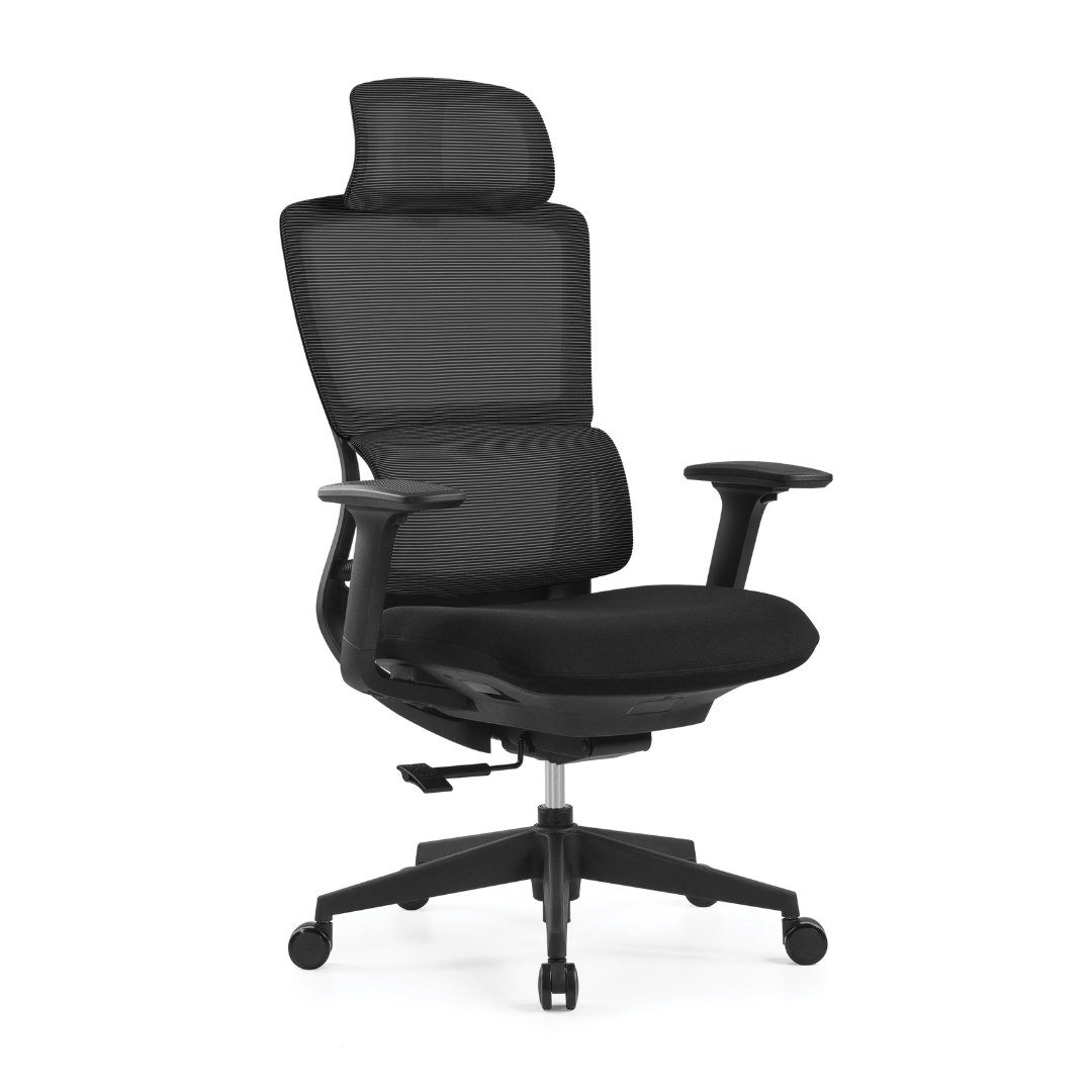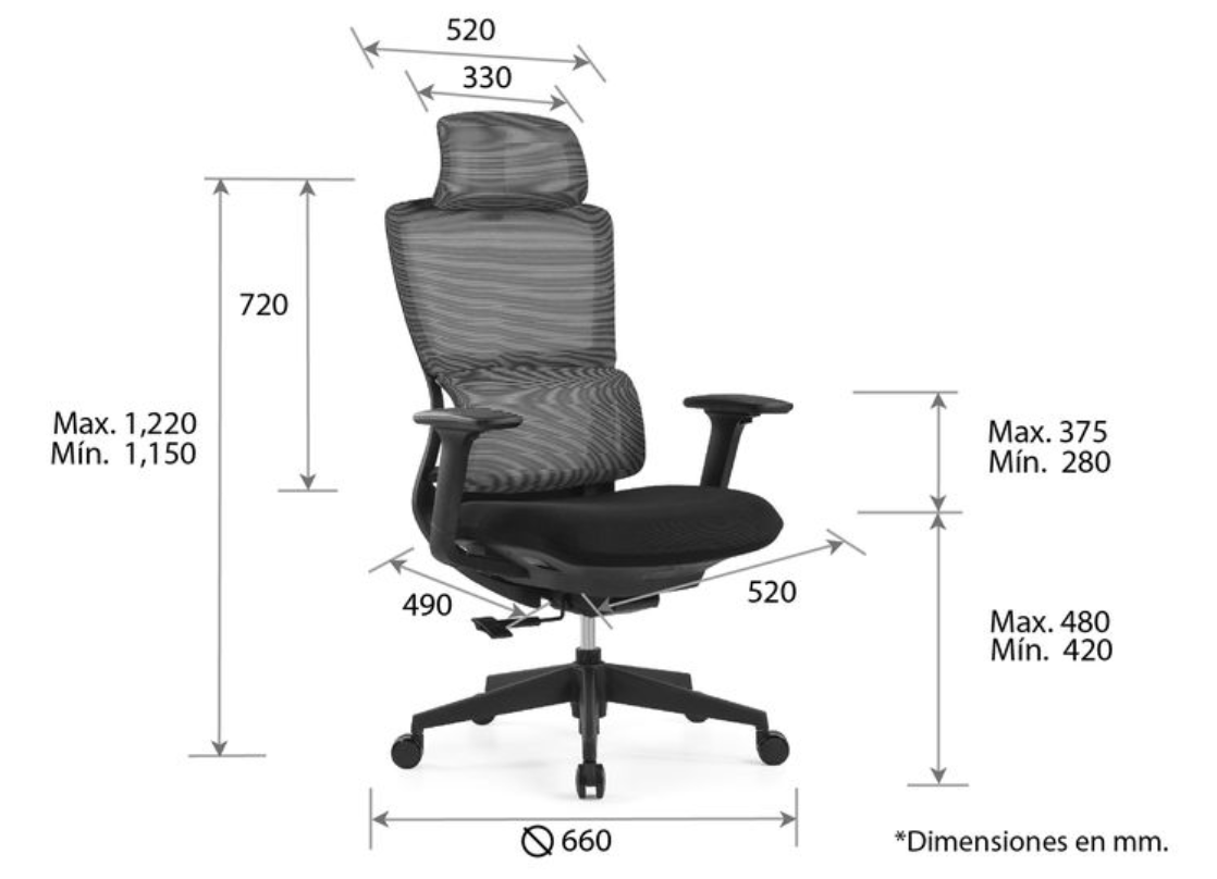 - Diseño: Diseño ergonómico de respaldo alto con soporte lumbar flotante y cabecera opcional, respaldo en malla color negro con bastidor de poliuretano de alta densidad, asiento con acojinado de espuma de alta densidad (40 kg/m³) con retardante a la flama y alta resiliencia, brazos tipo 3D ajustables en 10 posiciones, fabricados en poliuretano suave con diseño anti-derrapante.
