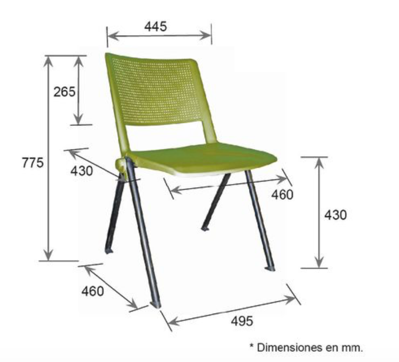 - Diseño: Ergonómico con respaldo y asiento fabricados en copolímero de polipropileno de alta durabilidad. La fijación de la concha a la estructura se realiza mediante pijas de seguridad. Se ofrece en una variada gama de colores: negro, azul marino, verde, naranja, arena, blanco, rojo y gris.